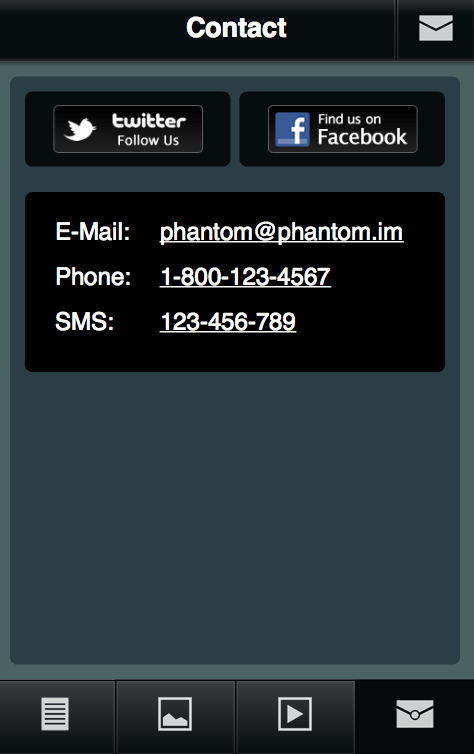 Includes Twitter and Facebook follow buttons, so the users can easily reach you or your business.